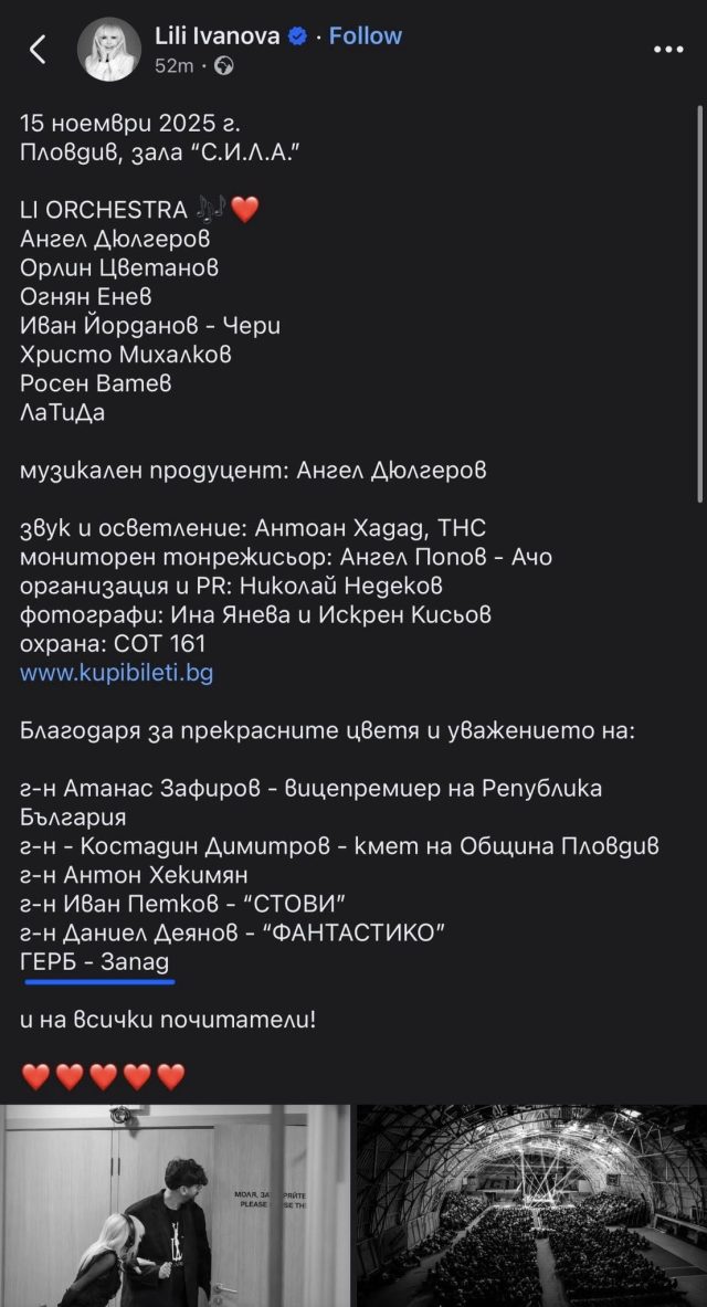 След чудния си концерт в Пловдив, Лили Иванова благодари на кмета Димитров и ГЕРБ – Запад