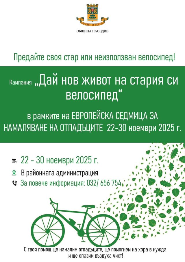 Община Пловдив разширява участието си в Европейската седмица за намаляване на отпадъците с още една значима инициатива – кампанията „Дай нов живот на стария си велосипед“. Тя има за цел не само да насърчи отговорното отношение към околната среда, но и да подкрепи хора в уязвимо положение чрез осигуряване на алтернативен, достъпен и екологичен транспорт.