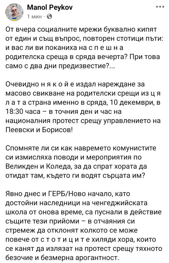 Изкусният певец на „Катюша“ разтресе Пловдив с драматична измама. Неугледният депутат на ДеБъ и присъдружният му Чило Попов заляха социалните мрежи с лъжата, че директори на пловдивски училища си измислили спешно родителски срещи утре вечер, за да не ходели родители и деца на протест.