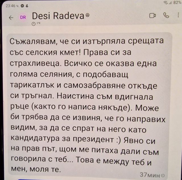 Снимката е съобщението, което Десислава Радева е написала на Веселина Томова: