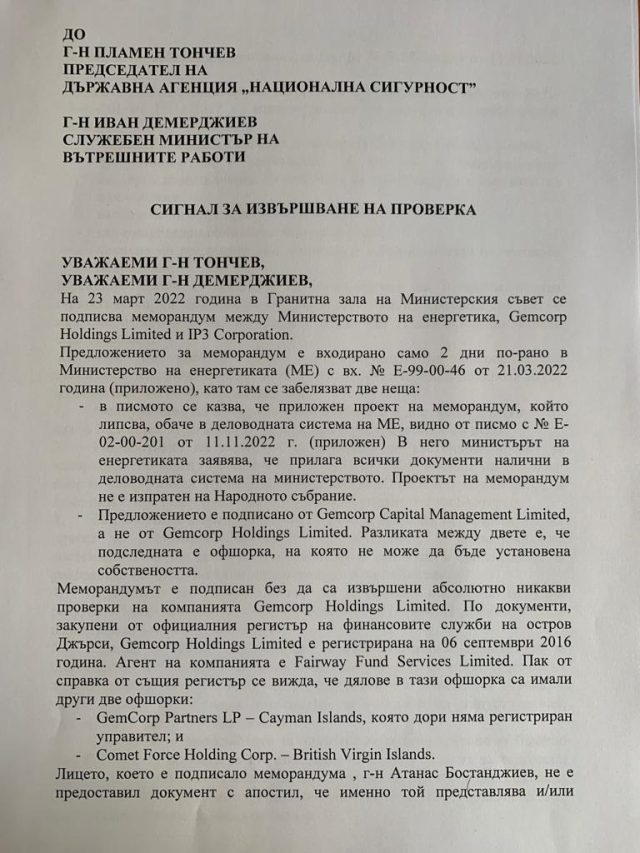 Народният представител Десислава Трифонова, заедно с депутати от ПГ на ГЕРБ-СДС внесоха сигнал до ДАНС и МВР за подписания от правителството на Кирил Петков меморандум с Gemcorp Holdings Limited. ,,Искаме проверка за извършени закононарушения, както и дали извършените закононарушения съставляват неправомерни деяния по смисъла на Наказателния кодекс“, коментира Трифонова. ,,На 23 март 2022г в Гранитна зала на Министерски съвет се подписва Меморандум между Министерство на енергетиката, Gemcorp Holdings Limited и IP3 Corporation. Предложението за меморандум е входирано само 2 дни по-рано в МЕ“, се посочва в сигнала.